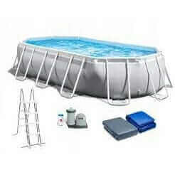 Комплектът включва всичко необходимо за да започнете веднага да се наслаждавате на вашия нов басейн: филтърна помпа с картушен филтър Intex Krystal Clear™ с капацитет 5678 л/ч, сменяем картушен филтър тип A, гофрирани тръби и конектори за свързване на басейна с филтърната помпа, подложка за басейн, покривало за басейн, стълба за басейн Intex 28076 със сваляеми стъпала, както и резервна лепенка за поправка.