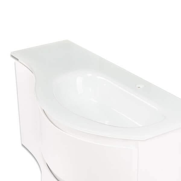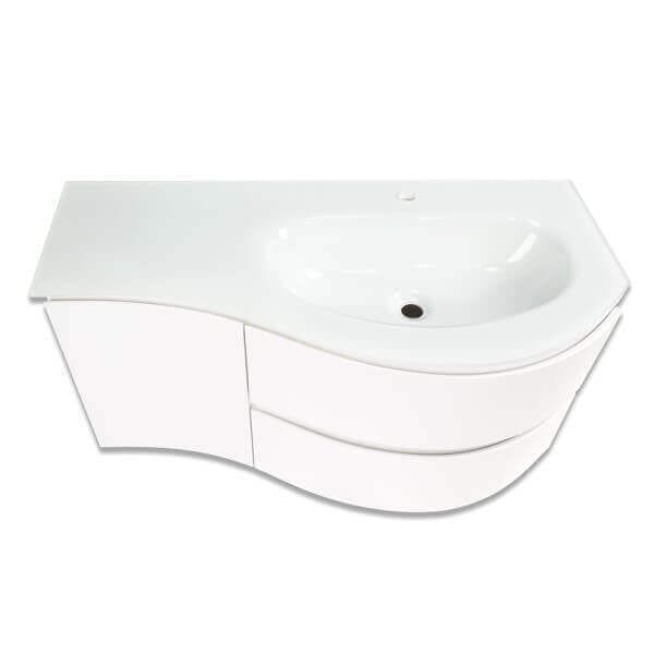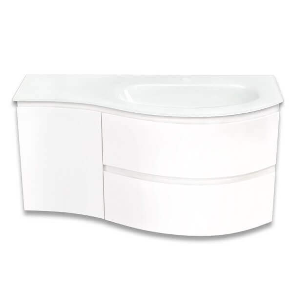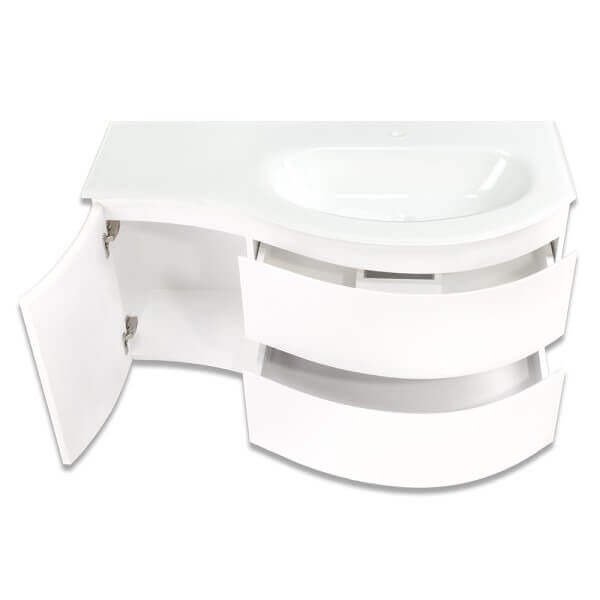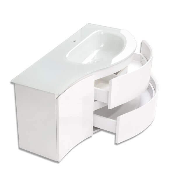 Долен шкаф за баня със стъклена мивка Makena е идеалното решение за вашата баня. Неговият елегантен дизайн и бял гланц добавят стил и изисканост. С размери 98х46х48,5 см, шкафът осигурява достатъчно пространство за съхранение на всичките ви принадлежности. Двете чекмеджета и една врата предлагат удобен достъп до всичко необходимо.