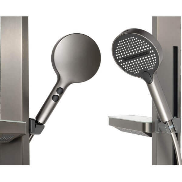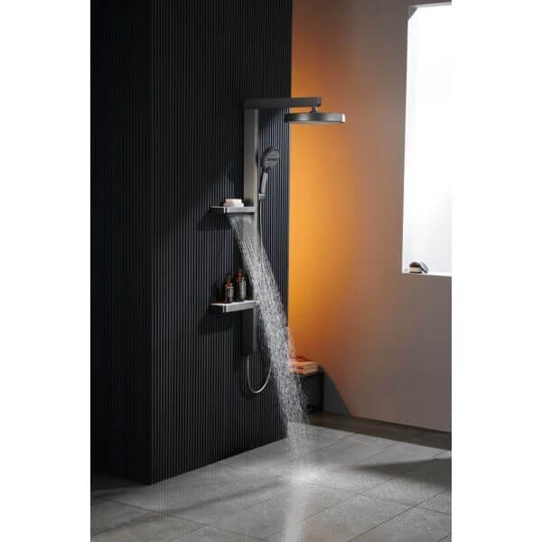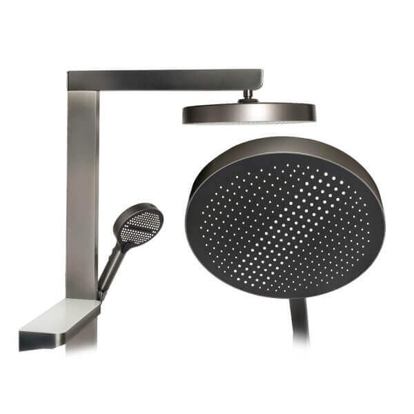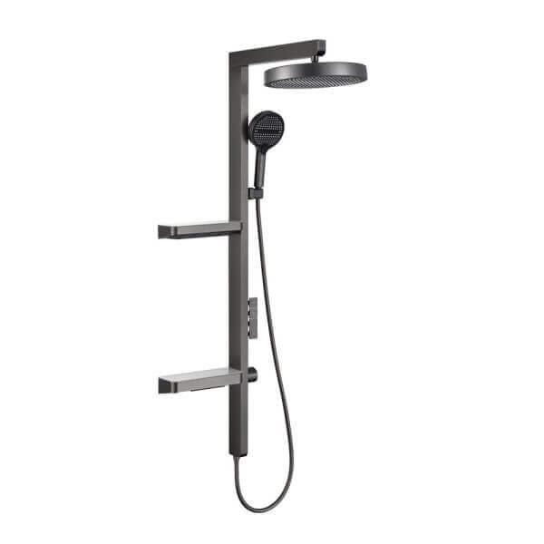 Месингов душ комплект Oval Gun grey с термостат предлага съвременен дизайн и висока функционалност за вашата баня. Изработен е от неръждаема стомана и месинг, което гарантира дълготрайност и устойчивост срещу корозия. Комплектът включва кръгъл дъждовен душ, струя за тяло и ръчен душ, осигуряващи комфорт и разнообразие при ползване. Вградената двойна етажерка добавя удобство за съхранение на принадлежности.