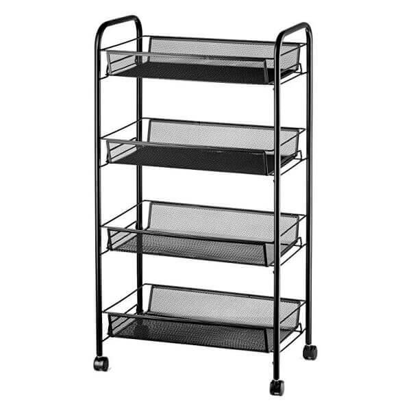 Метален стелаж на колела с 4 нива, черен, 27x48x84 см осигурява достатъчно място за съхранение на различни вещи у дома или в офиса. Металната конструкция с диаметър 16 мм гарантира здравина и стабилност, а лекото тегло от 2.2 кг позволява лесно преместване благодарение на колелцата. Черният му цвят придава стилен и универсален вид, който се вписва безпроблемно във всеки интериор.