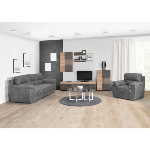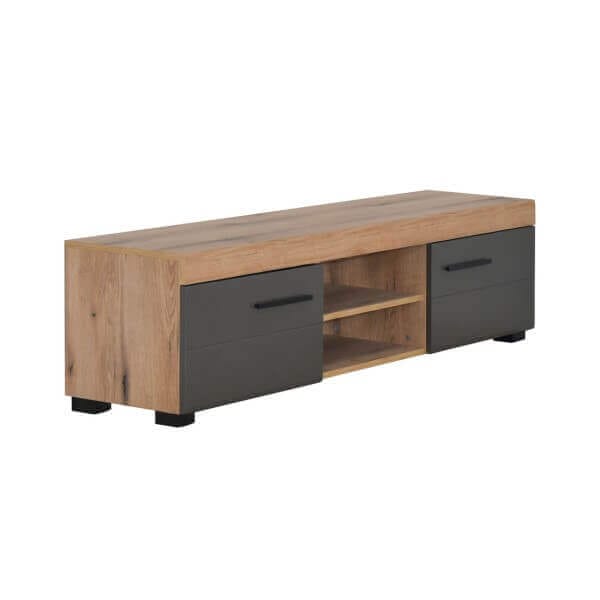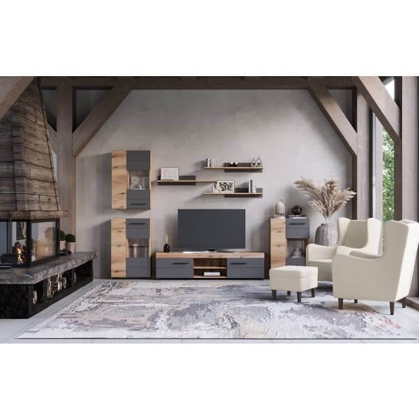 TV шкаф Barcelona Артисан съчетава стил и функционалност с качествени материали и изчистен дизайн. Корпусът от 18 мм ПДЧ с декор Дъб Артисан и лице от 19 мм МДФ в комбинация с Дъб Артисан и Сиво гланц придават модерна и топла визия на всяка дневна. Заоблените ръбове Soft forming осигуряват безопасност и елегантност, а PVC крачетата гарантират стабилност. Този TV шкаф Barcelona Артисан е практично решение за организация на техника и аксесоари, което ще допълни интериора с изискан акцент.